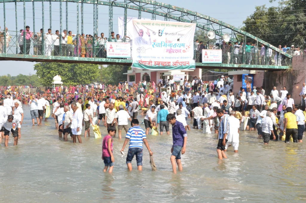 During the Haridwar Seminar Katha in 2013, Swamishree inspired saints and devotees to participate in a one-day initiative to cleanse the sacred river Ganga, fostering respect for its purity and divinity.