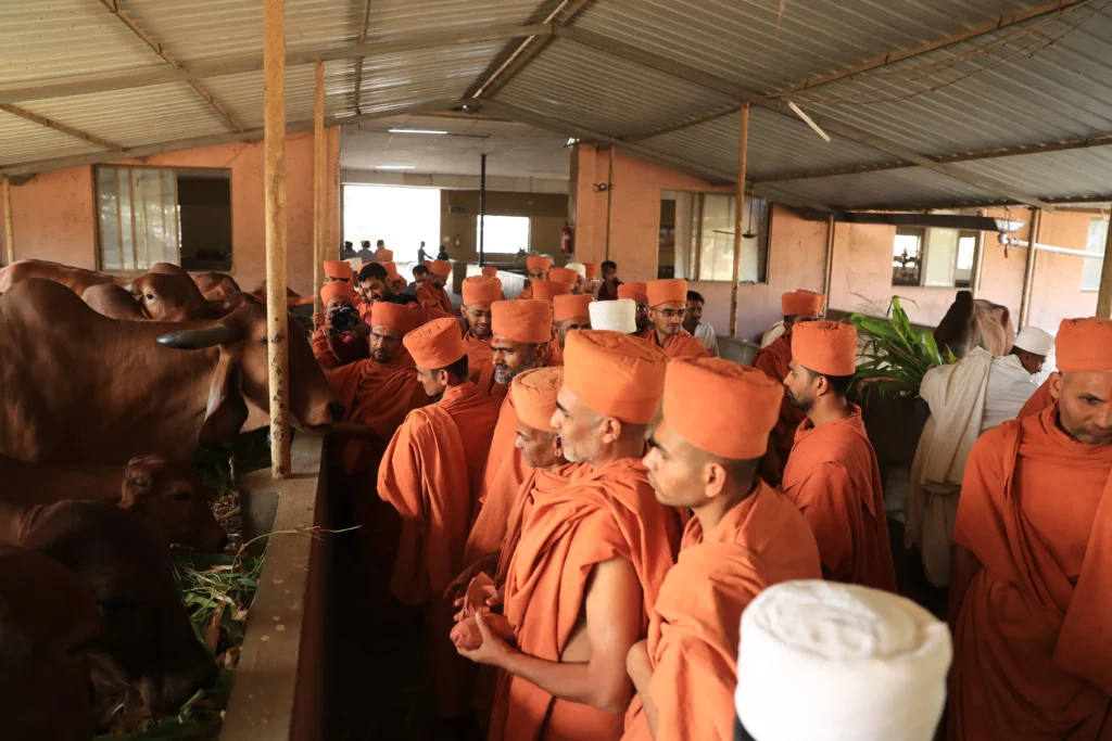 At Tirthdham Sardhar, over 100 Gir cows are currently sheltered, cared for, and nurtured under Swamishree’s guidance, reflecting the spiritual value of compassion for all living beings.
